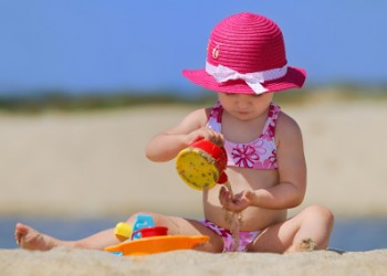 Copilul mic trebuie să stea sub umbrelă (cu protecție UV) și să fie protejat cu cremă cu SPF crescut (50+), un costumaș pe partea superioară a corpului și pălărie. Dacă este puțin mai mare și este la etapa descoperirilor, părinții trebuie să-l supravegheze îndeaproape pentru că tendința este să ducă tot ce găsește la gură. Genta de plajă trebuie să includă schimburi, scutece, creme, șervețele umede.