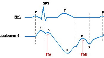 • <x> - corespunde ejecţiei VD şi prin tracţionarea în jos a planului ventil al inimii scade presiunea atrială, scădere reflectată retrograd şi în vena jugulară; unda x este sincronă cu unda pulsatilă arterială
