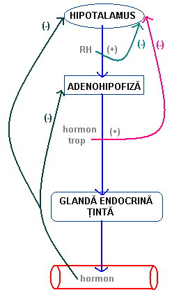 - buclă lungă: creşterea concentraţiei plasmatice a hormonului secretat de glanda endocrină ţintă (aflată sub control trop hipofizar) determină scăderea secreţiei de hormoni hipotalamici eliberatori (determină totodată şi scăderea eliberării de hormoni tropi hipofizari)