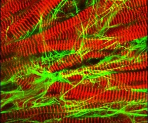 foto: mușchi cardiac cu fibre musculare (roșu) și fibroblaști (verde), sursa
